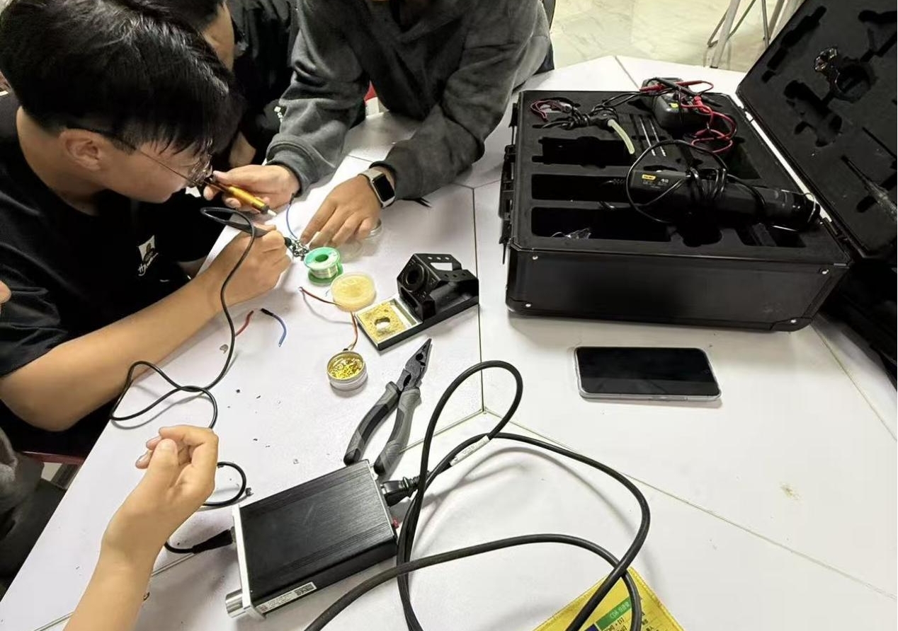 10月16日,创新创业学院无人机工作室实训室内马达轻鸣,50 余名学生分组围站操作台,在专业教师指导下完成无人机的机架拼接、飞控接线与转向调试。这场沉浸式教学活动通过“理论拆解 + 实操攻坚”模式,让学生亲手将零散组件转化为可运行的无人机设备。
