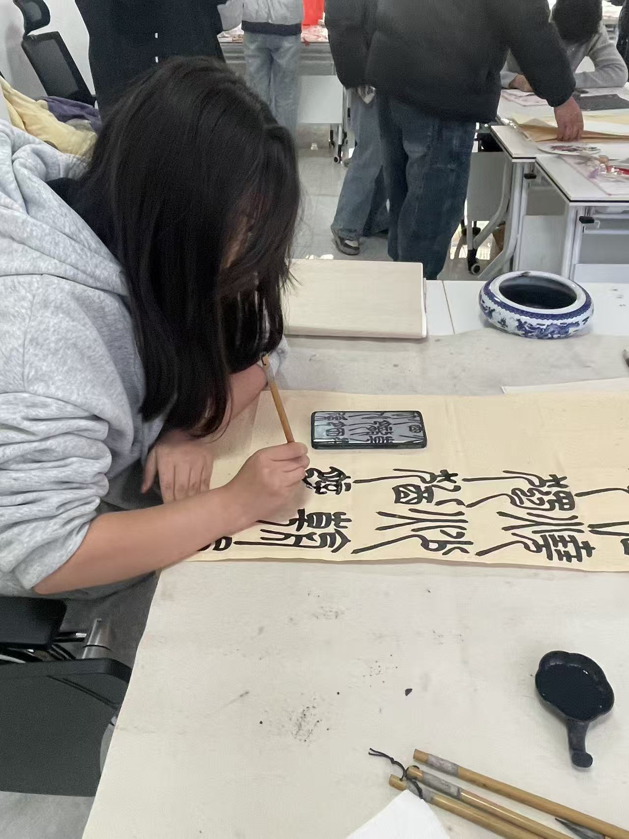开展期间,创新创业学院书法工作室化身校园里最具文化气息的打卡地,每天都吸引着大批学生慕名而来。步入展厅,一幅幅笔墨佳作错落有致地陈列其间,或端庄典雅、或潇洒飘逸、或雄浑刚健、或灵动娟秀,墨香与纸韵交织,让人仿佛置身于书法艺术的殿堂。软笔作品中,楷书工整规范、结构严谨,一笔一划尽显端庄大气;行书流畅自然、收放有度,笔墨流转间暗藏神韵;草书恣意奔放、气势磅礴,寥寥数笔却极具感染力;隶书古朴厚重、蚕头燕尾,尽显汉隶的庄重典雅。硬笔作品则以简洁明快的风格,展现出扎实的书写功底,或清雅俊秀,或刚劲有力,在方寸之间演绎书法之美。